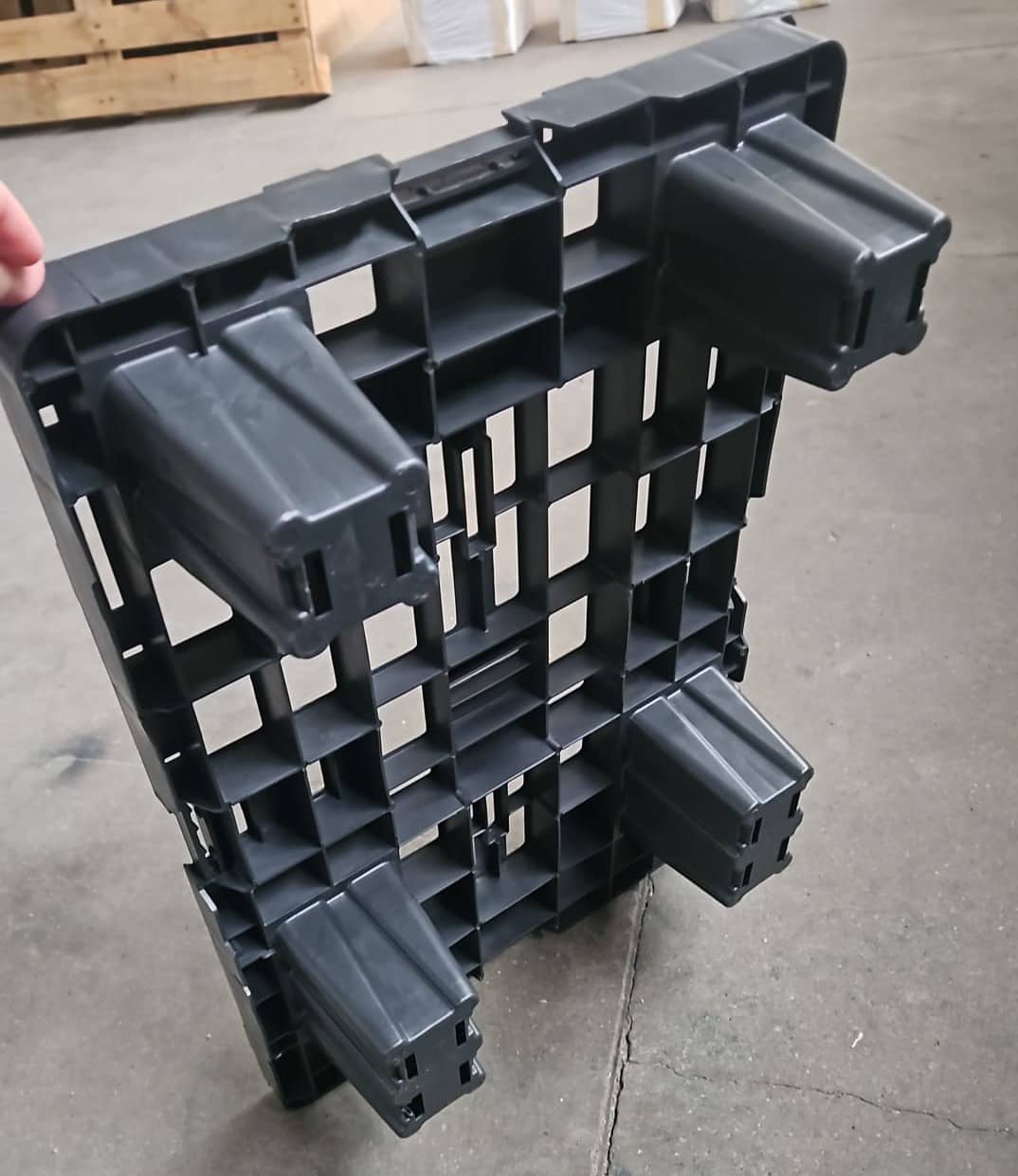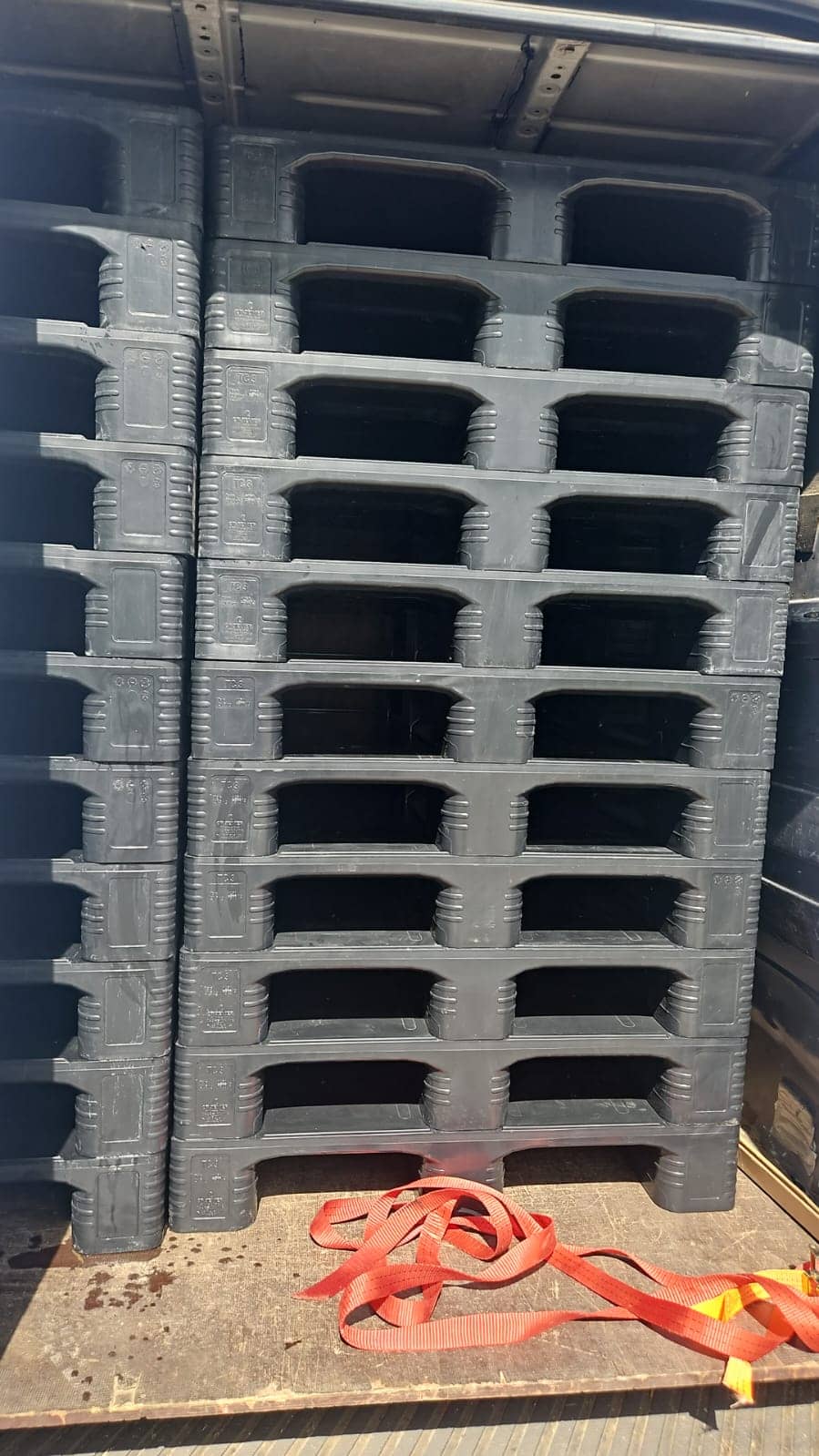 These pallets have advantages during transport. Unlike wooden or Euro pallets that have a higher weight and are stacked paired (one with legs up and one with legs down), plastic pallets have a much bottom weight and are stacked in the nest (one enters the other). Practically about twice as many plastic pallets as wooden pallets fit in a lorry.